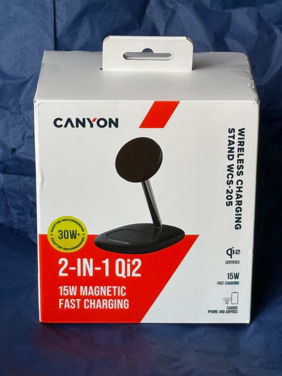 The Canyon 2-In-1 Qi2 Charging Stand doesn’t have an on/off button and no light to tell you that it’s got power, so you have to test it with your iPhone to see if it’s working. The iPhone will display ‘charging’ in the top right corner. I don’t have any other wireless ear buds or any other make of mobile phone in the house to see if it works on other makes, so for the time being I’m sticking with the Canyon 2-In-1 only charging Apple products but if you look on the website, there are other appliances which are compatible. It does charge quickly. I’d say it charges about as quickly as the Apple charger does, and I was cabled through my laptop to charge the iPhone.