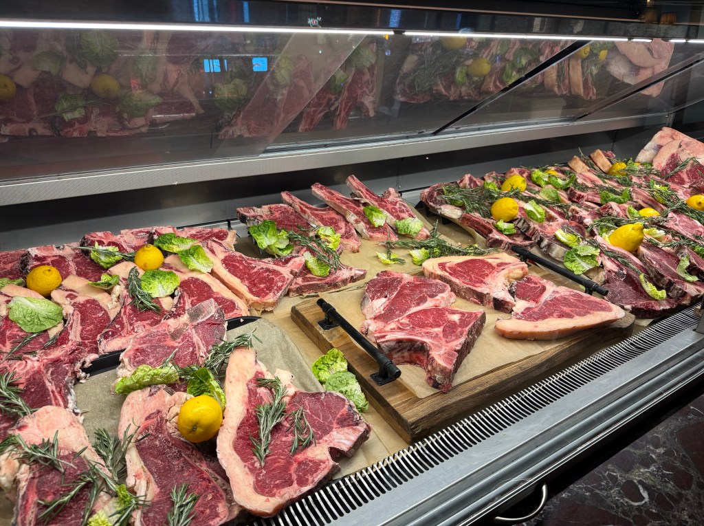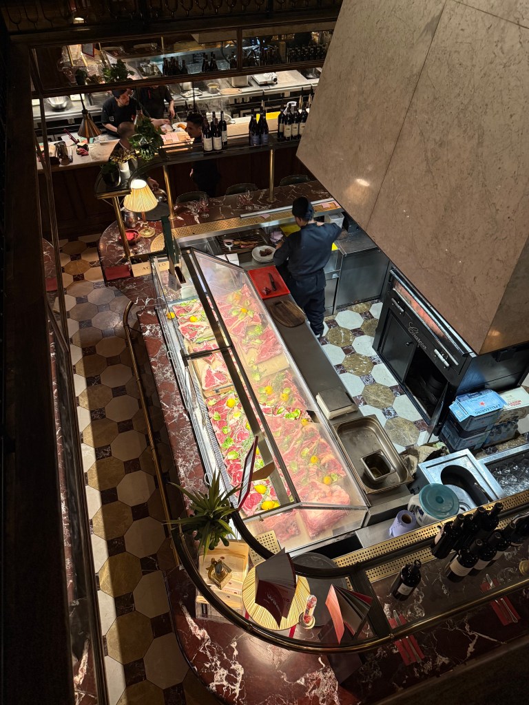 The first glimpse as you venture indoors is the huge meat counter. Rows of steaks ready to be cooked in the kitchen are lined up ready to eat. The restaurant is rustic, as if you are in a restaurant in a non-touristy town somewhere in Tuscany and everyone speaks only Italian, and the lights are low. The tables are arranged in a café style and the centre of the ceiling opens up to the second floor of the restaurant, where you can see more people dining and another bar awaits you.
