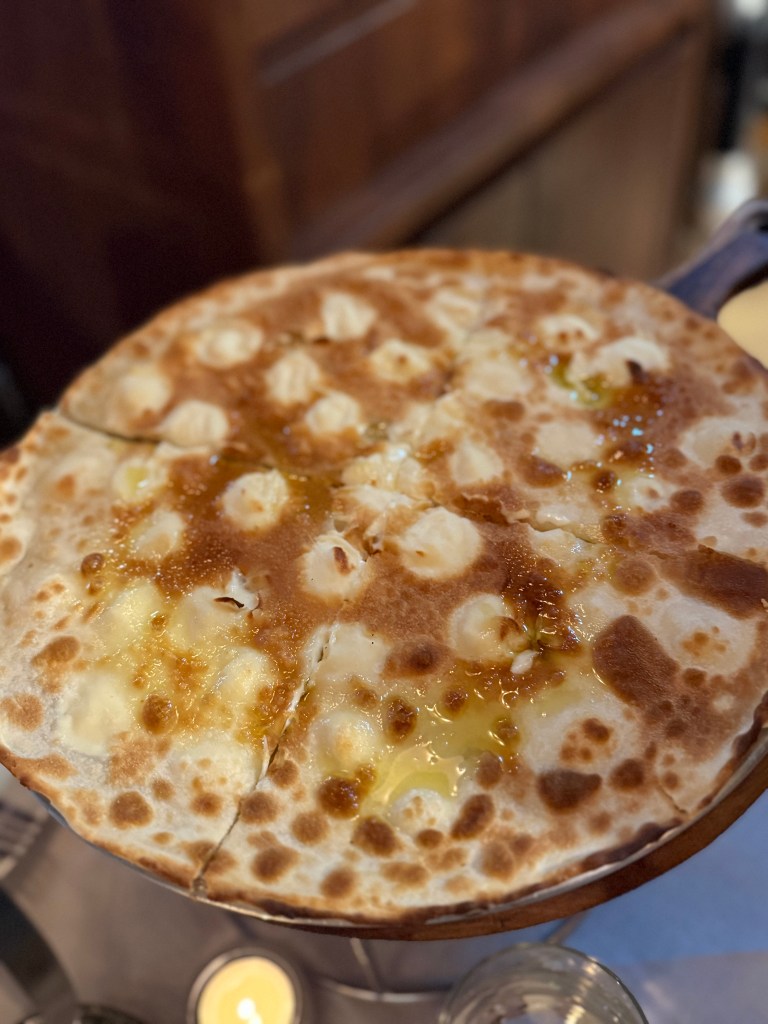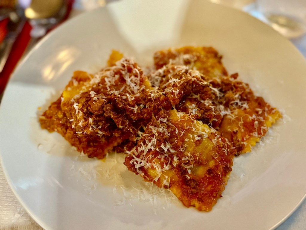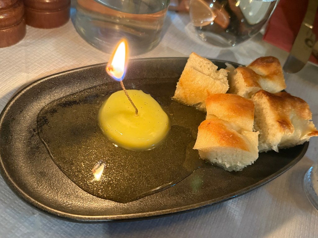 The menu is a mixture of pasta and grill, with everything on the grill from cheeseburger to T-bone, but of course, the Italian version of T-bone! You can also choose spaghetti or ravioli ragu, like I did. The meats aren’t actually from Italy but from the Lake District, and aged 7 weeks to have the perfect tenderness and marbling. The breeds are a mix of Italian Maremmana and Angus beef to give a depth of texture and flavour. We were treated to a beef tallow dipping candle (as the candle melts, it created a fat reservoir to dip bread into). We also chose the Focaccia al Formaggio, which has a thin base and rich Stracchino cheese.