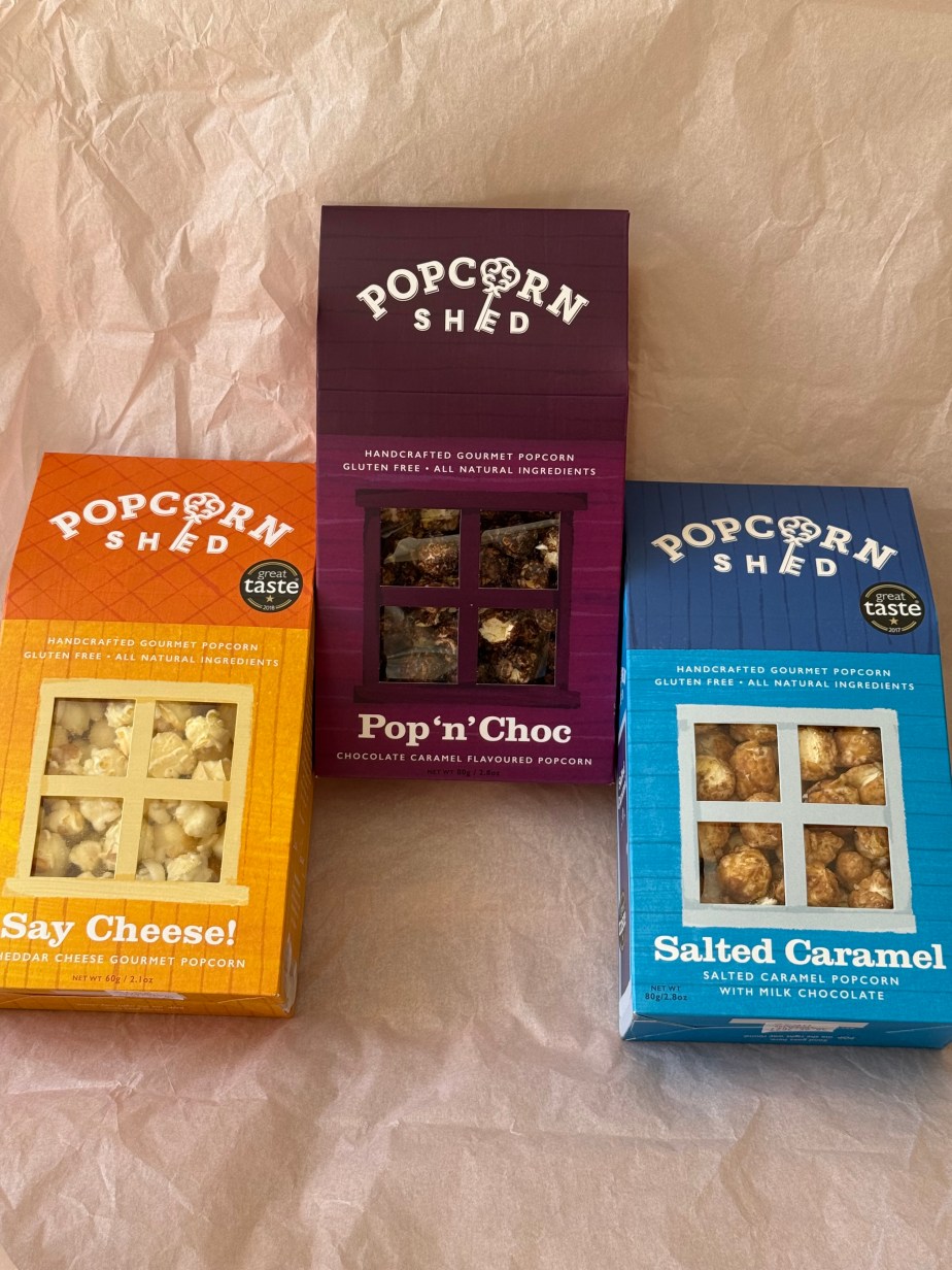 Each ‘shed’ (ie packet of popcorn) is 80 grams of popcorn. The Salted Caramel and Say Cheese flavours are both bestsellers and winners of the Great Taste award. 80 grams doesn’t sound like a lot but if you remember that popcorn is very light, it makes sense to say that each shed is about big enough for 2 people to share for a movie night, or the equivalent of a small mixing bowl size.