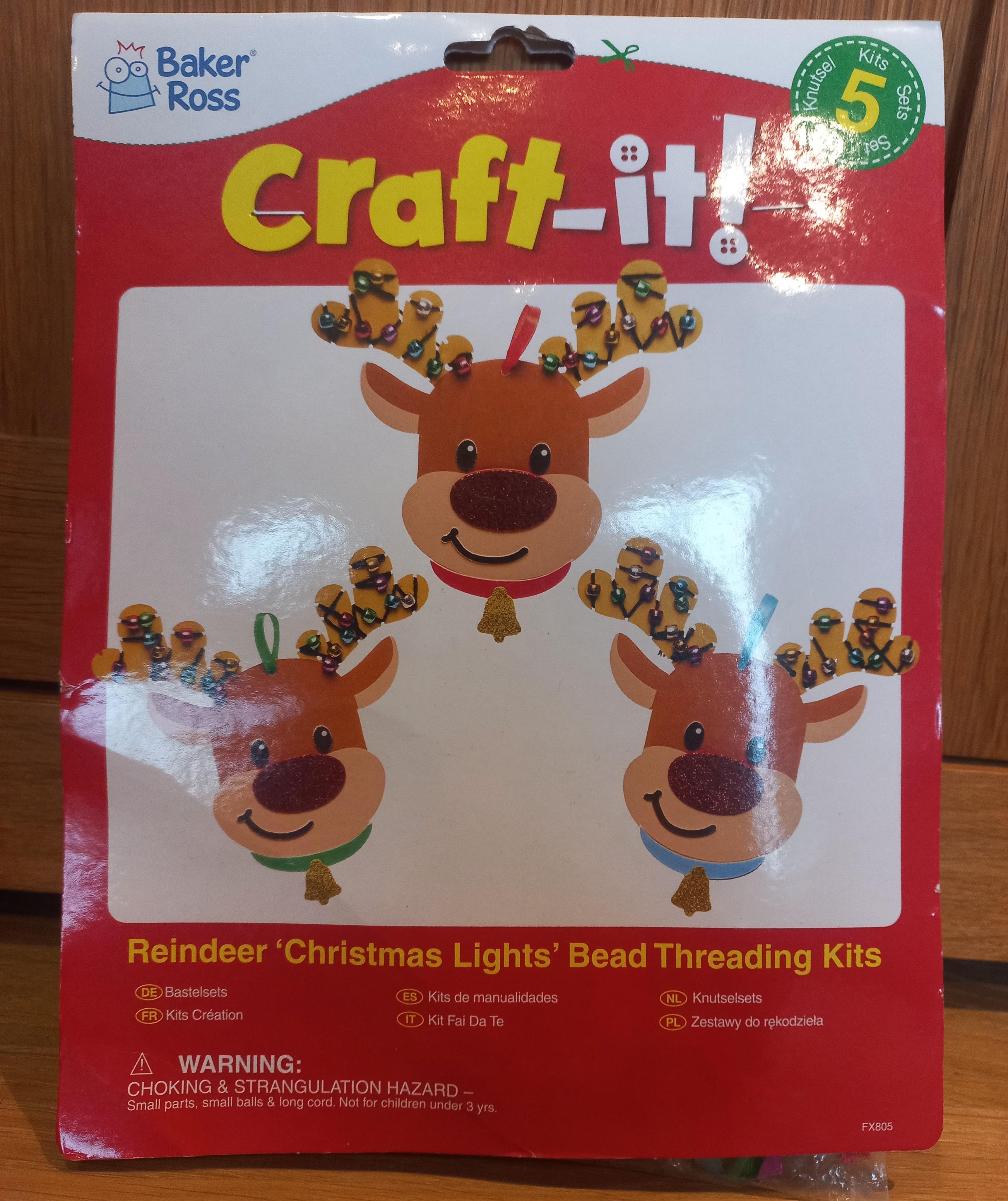 December can be such a busy month so it’s nice to slow down every now and again, enjoy some quiet crafting time and make a few special decorations or gifts for family members. Having used Baker Ross kits before with my Cub pack, I know how good they are so I was really pleased to try out a selection of their Christmas craft kits with our mini reviewers. Their ready-made kits take all the stress out of crafting with everything you need included in the sets. This week we tried three of the sets – the Reindeer “Christmas Lights” Bead Threading Kits, the Christmas Tree Kits and the Santa Chocolate Holder Decorations.