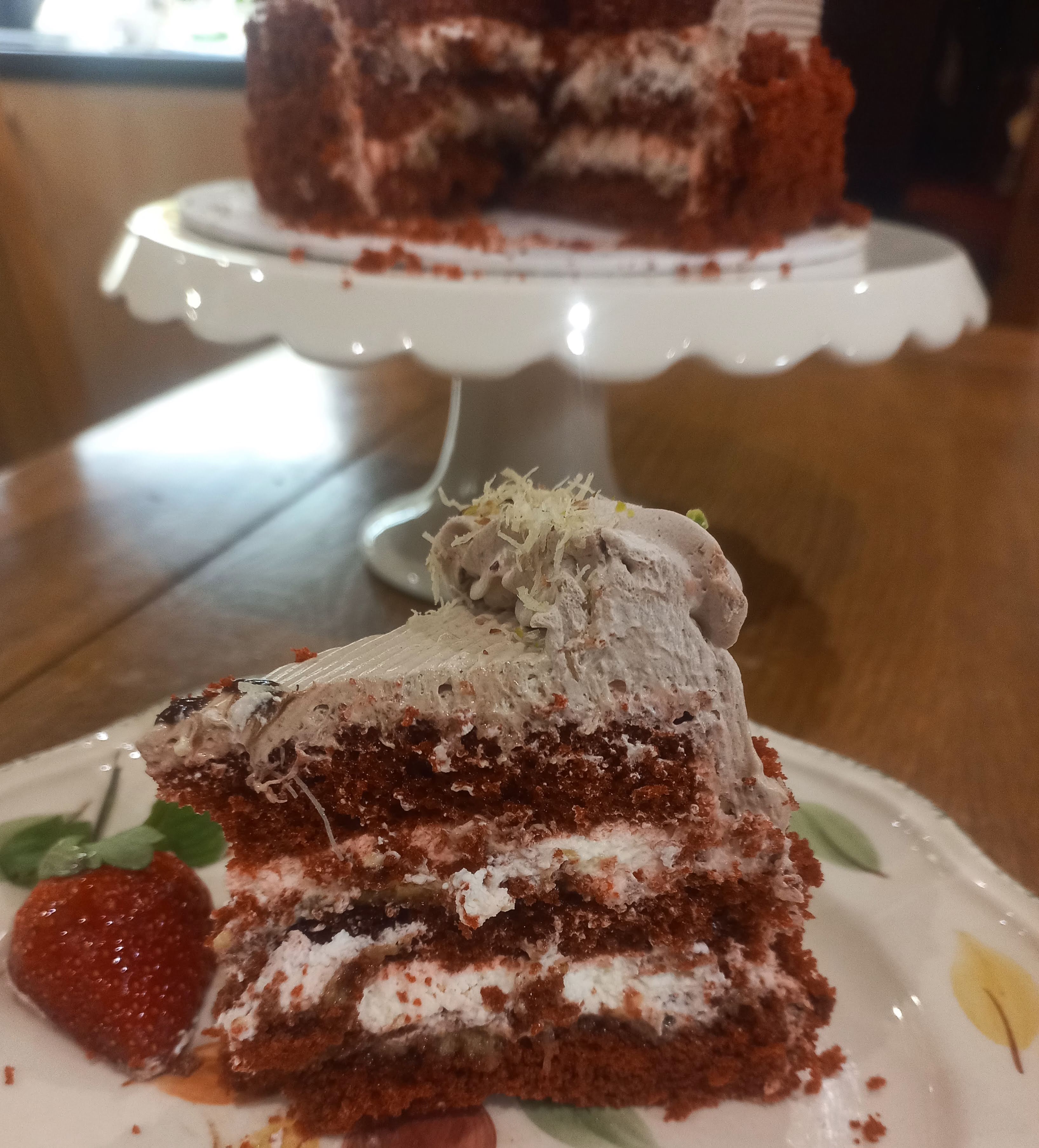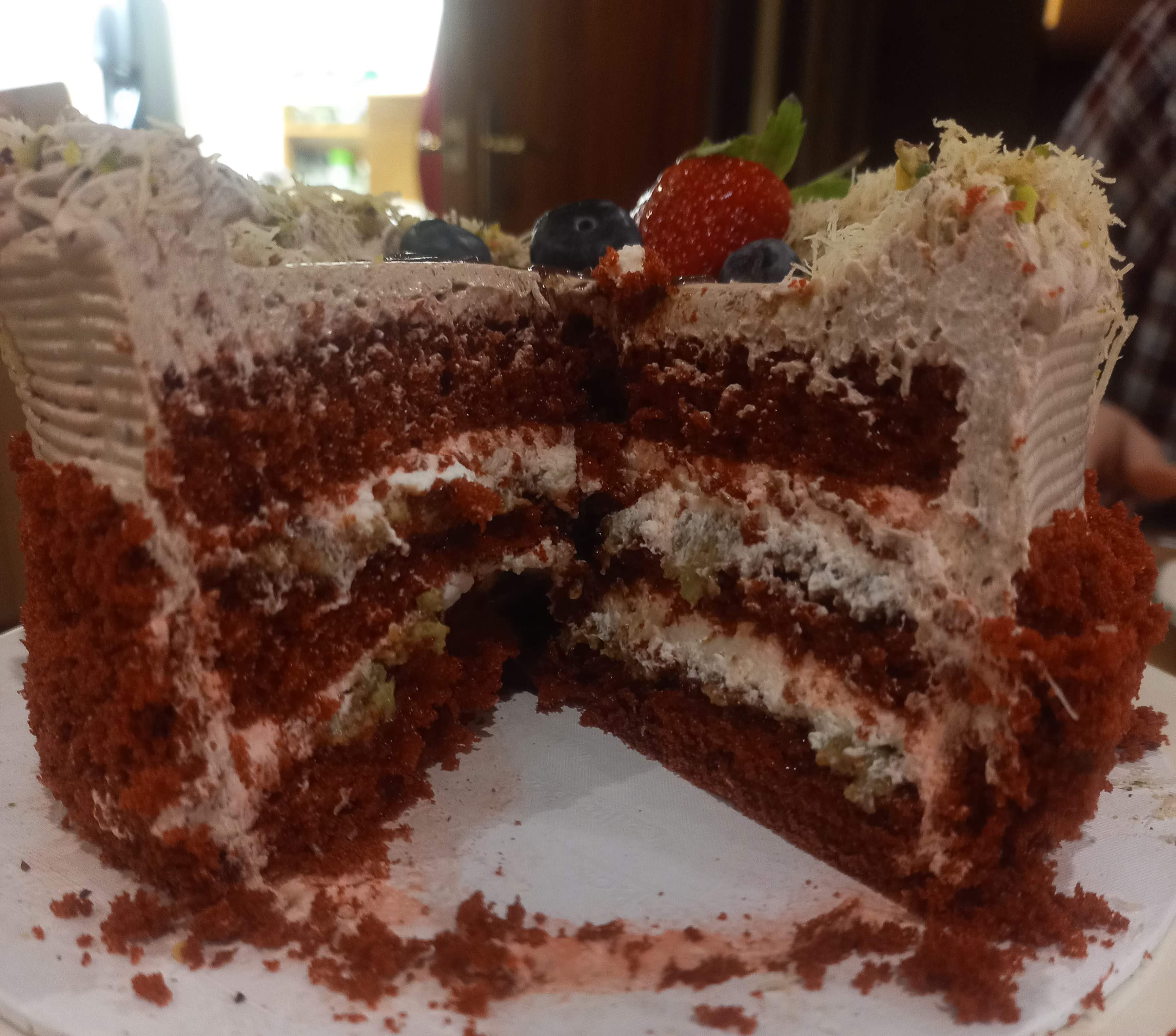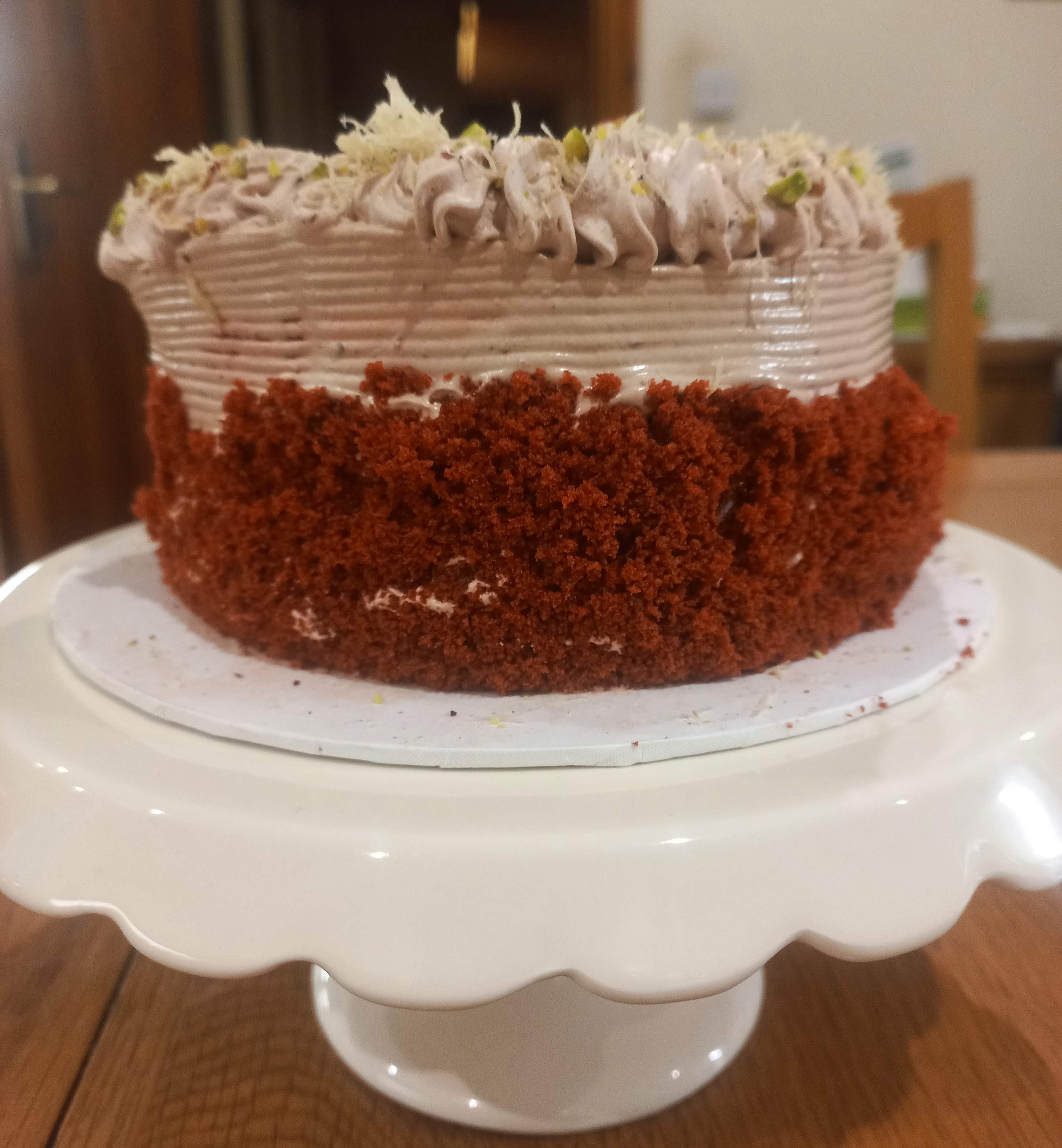 Our cake was delivered by a man in a car and it was well packaged in a large cake box. When I opened the box, it looked even more delicious than I’d hoped! The red velvet sponge had a lovely depth of flavour and wasn’t too sweet, while the pistachio and Dubai cream brought a luxurious nuttiness that worked incredibly well and make the cake incredibly moreish!