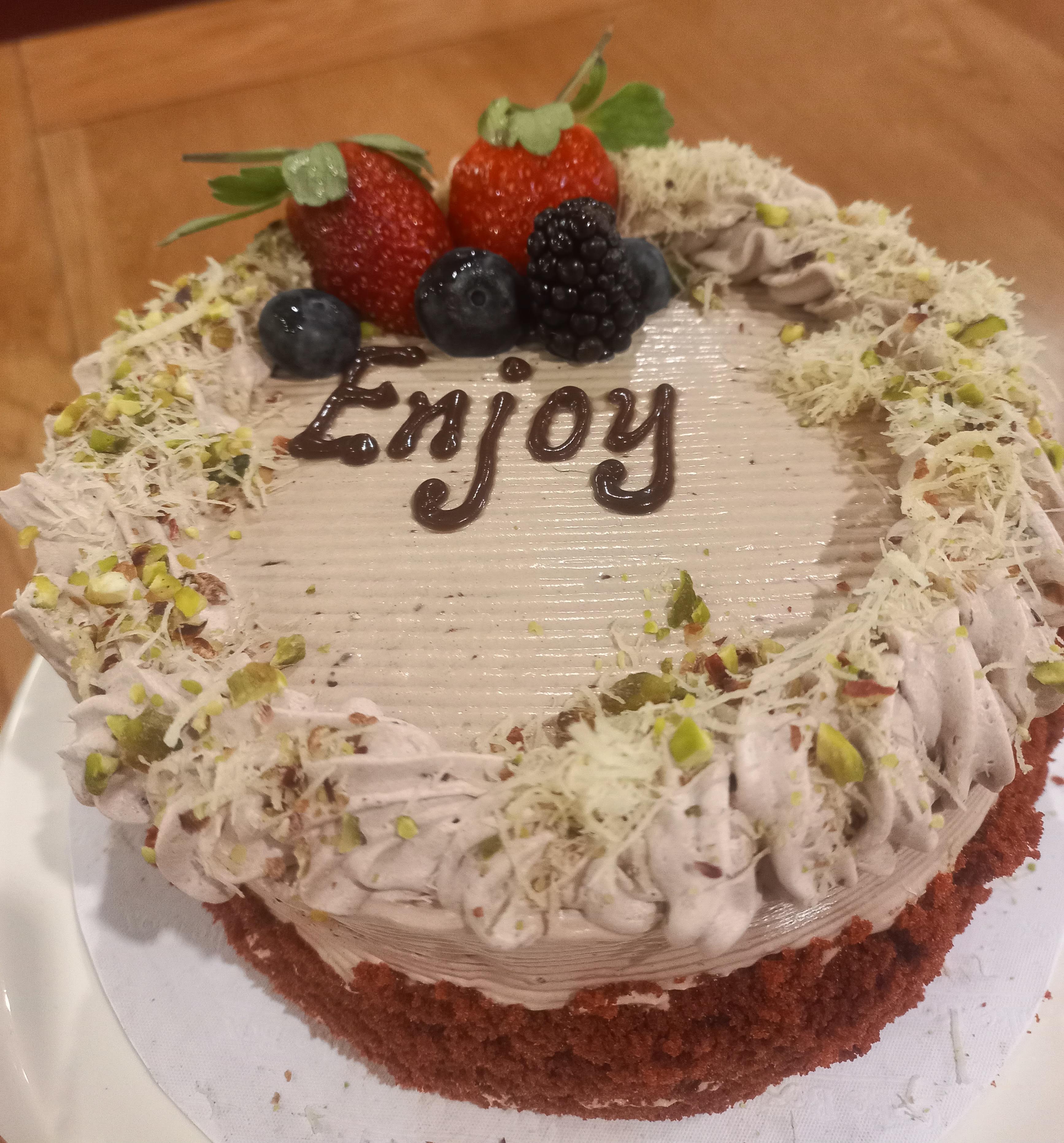 The cake is a beautifully light and moist red velvet sponge, generously layered with a silky pistachio cream and Egg Free Cake Box’s signature Dubai mix, which brings a gentle nuttiness and a pleasing sweetness. The sides are neatly finished with classic red velvet crumbs there’s also the option to personalise your cake; ours simply read “Enjoy”, but you can choose your own message when ordering.