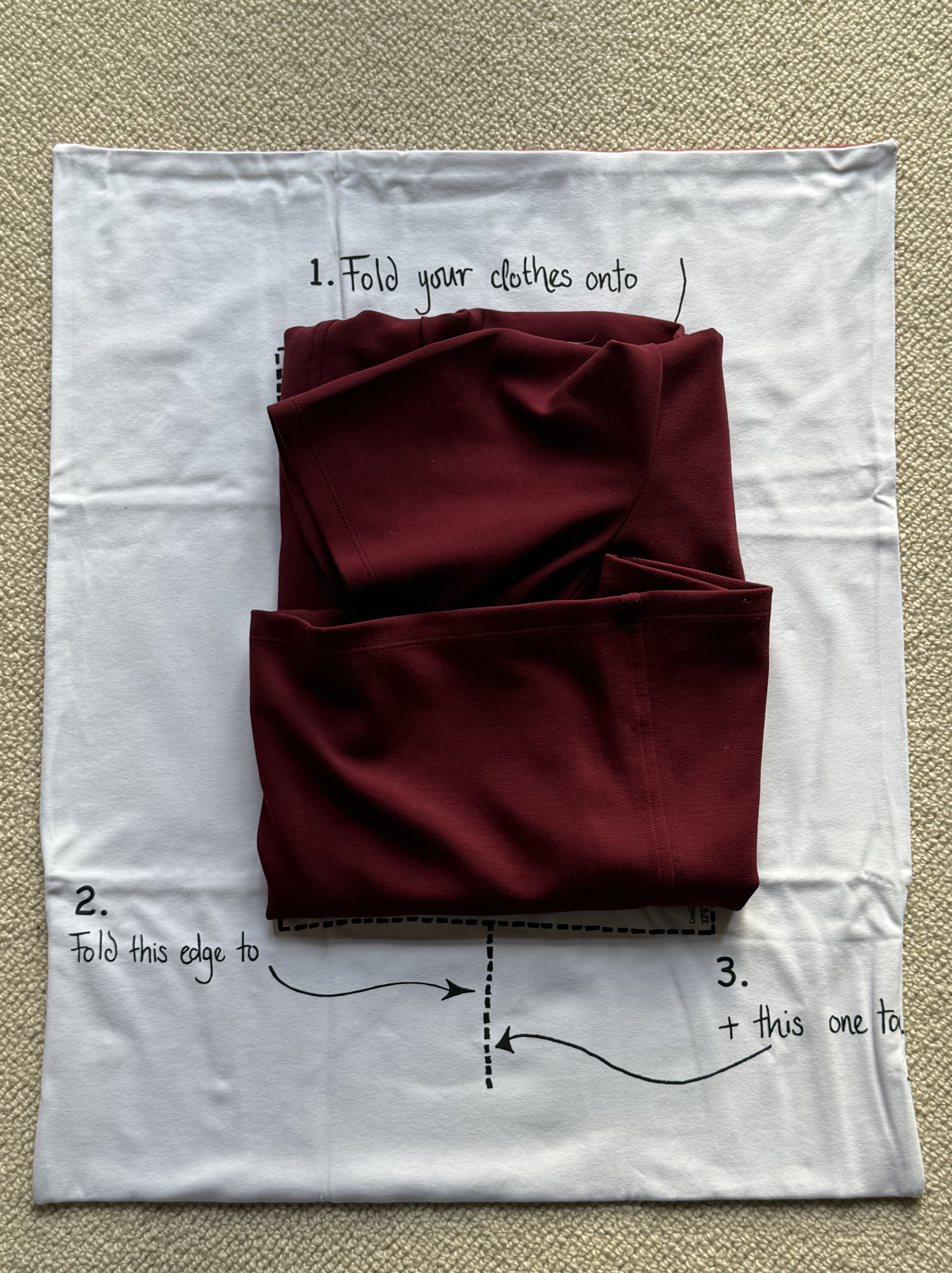 The premise of the invention is that the easily foldable contraption keeps your clothes enclosed but with minimum fuss and all you have to do is lay your clothes on the instruction side and fold and roll. The clothes are kept safe and also away from other objects in your bag. The instructions are all printed on one side of the garment bag, and the whole piece can encapsulate an outfit. The photos below show how you place a t-shirt (in this case) in the middle of the sheet, fold over the edges then roll into a Swiss-roll shape, folding over the last edge to keep it tight.