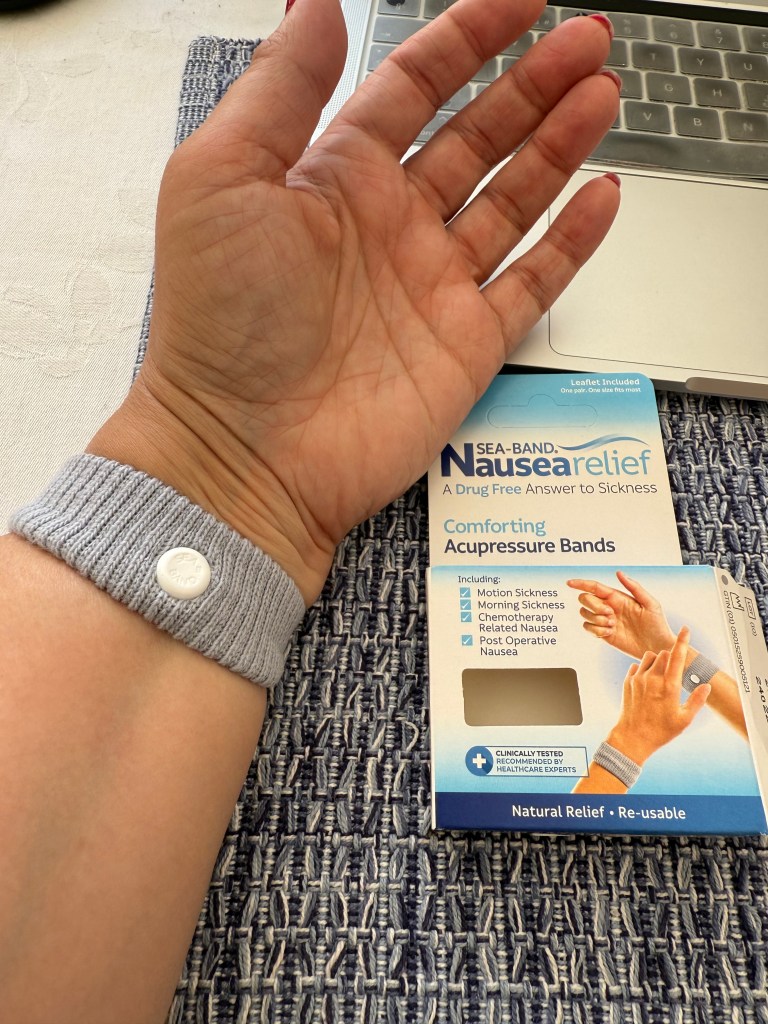 Sea-Bands have no side-effects and can be used all day to prevent relief, just be sure to adjust them if they come out of place. They’re re-usable too, so you can take them off and store them for another day and wash them gently under water. They’re also used for the symptoms of nausea resulting from anaesthesia and chemotherapy.