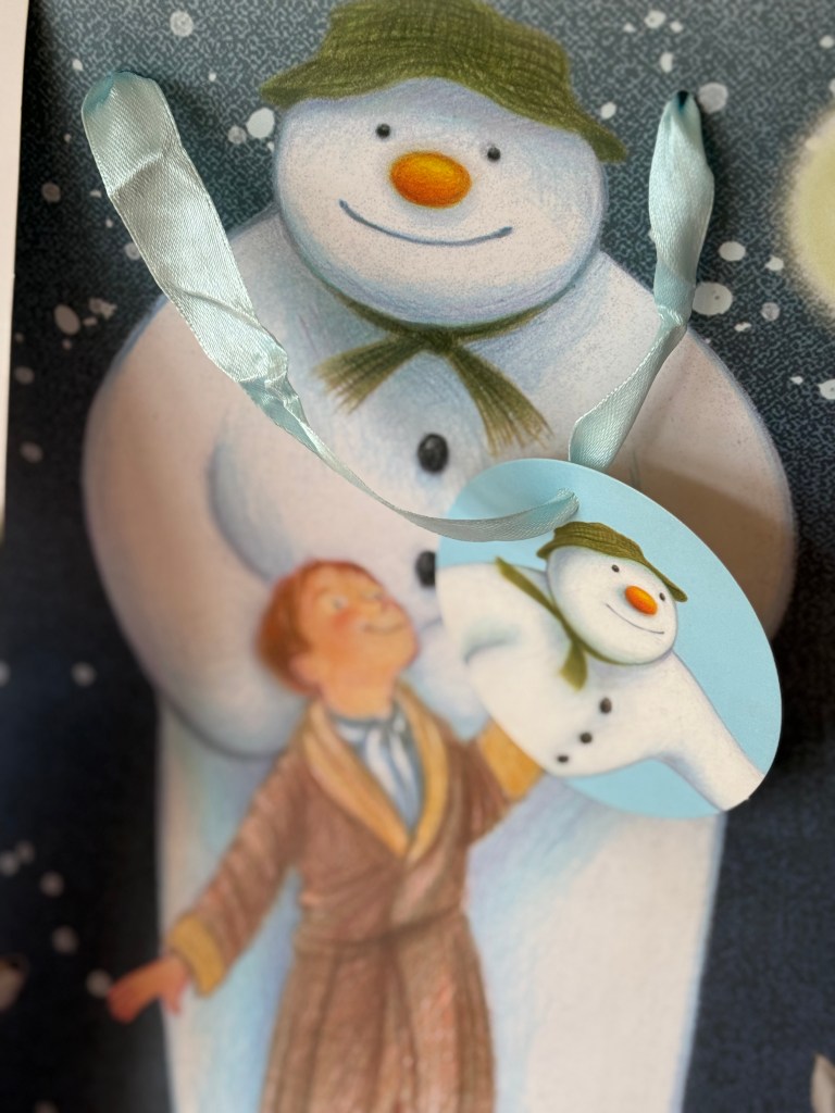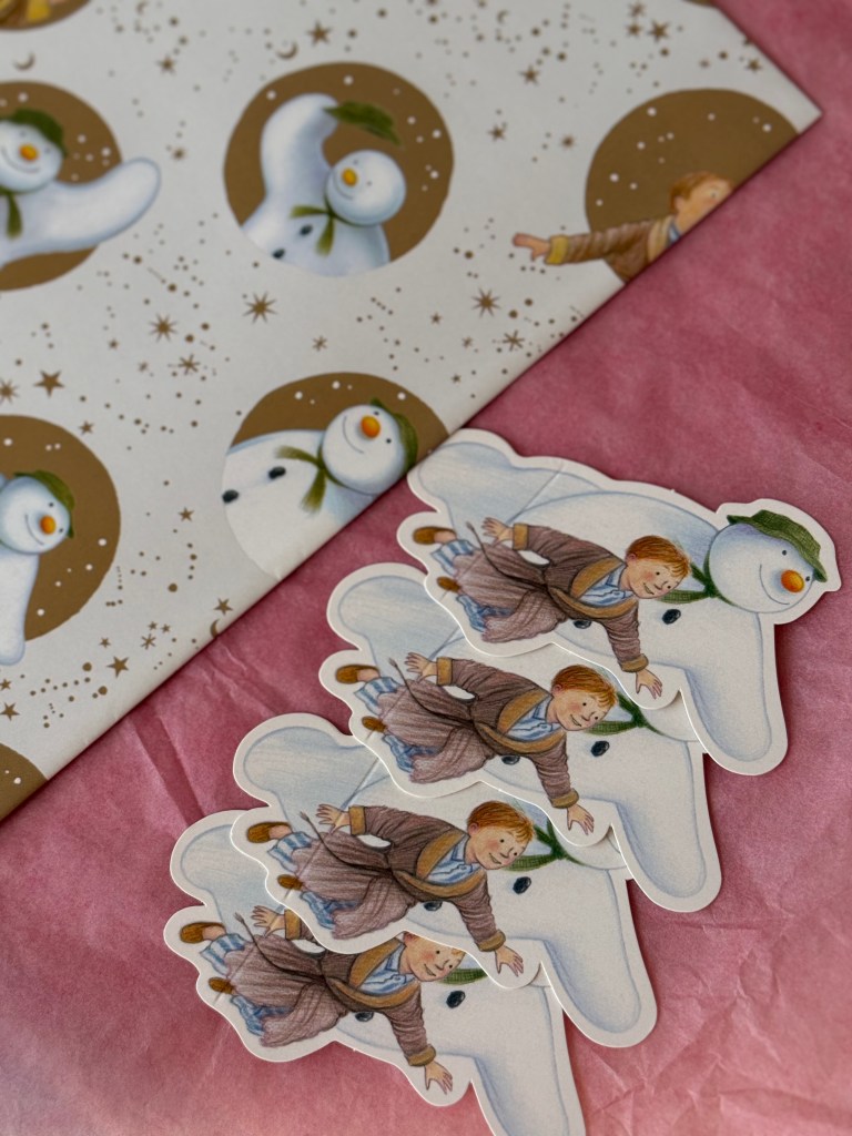 The wrapping paper features James, the boy from the animated film, alongside The Snowman in various poses. The 4 gift wrap sheets are all the same and measure 50cms by 70cms approximately, with 4 matching gift tags. The tags, which show James and The Snowman mid-flight, are folded in a way in which it looks like they’re suspended in air, so as you stick them to your gift, they’re lifted from the paper!