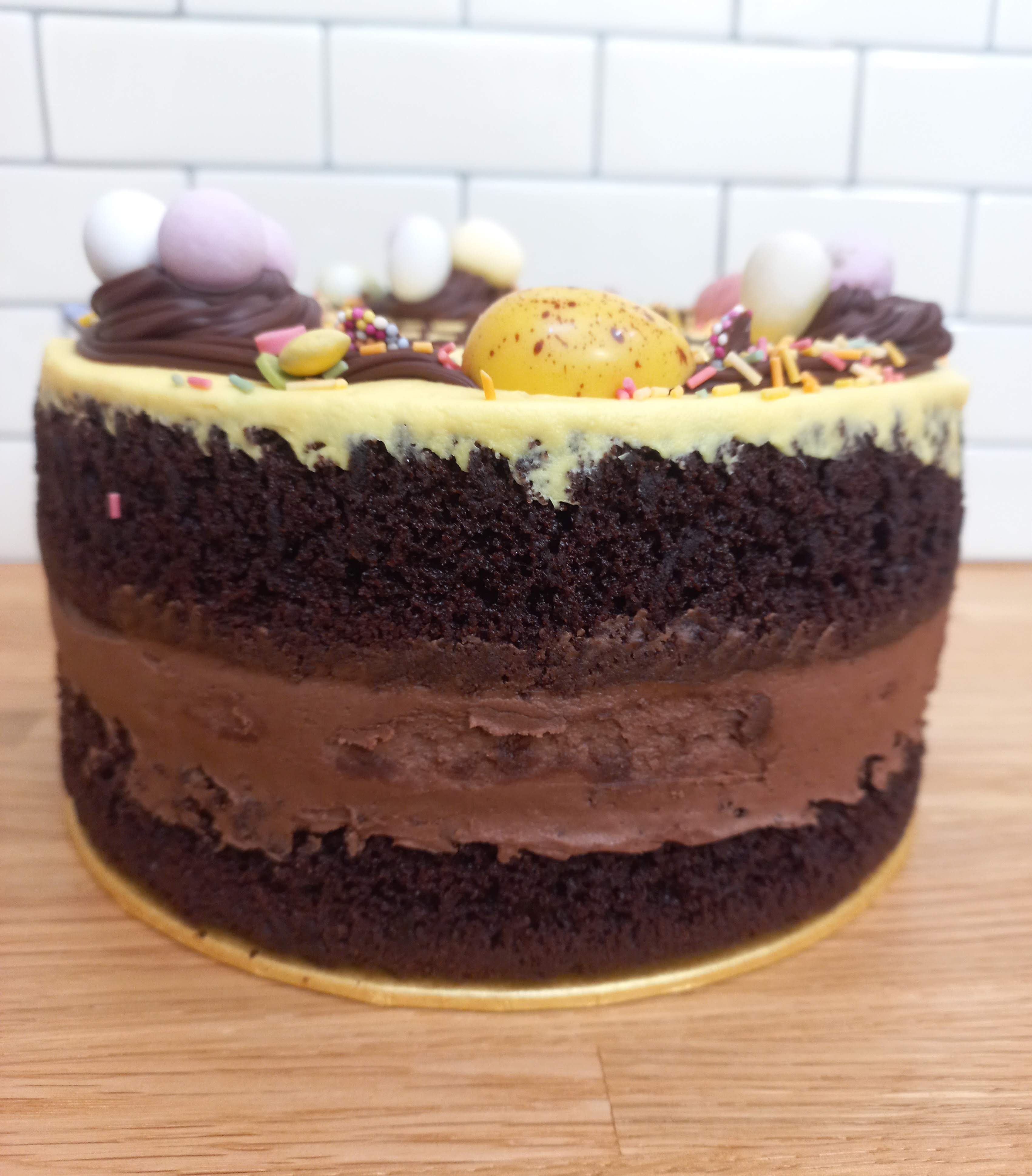 The cake itself is a luscious double chocolate sponge – lovely and light – layered with a generous helping of smooth chocolate fudge buttercream. The top is covered in a pretty pale yellow buttercream with glossy chocolate ganache, topped with mini eggs and a scattering of colourful sprinkles. There’s even space for a personalised message. We went with the classic “Happy Easter”, but you can choose your own wording.