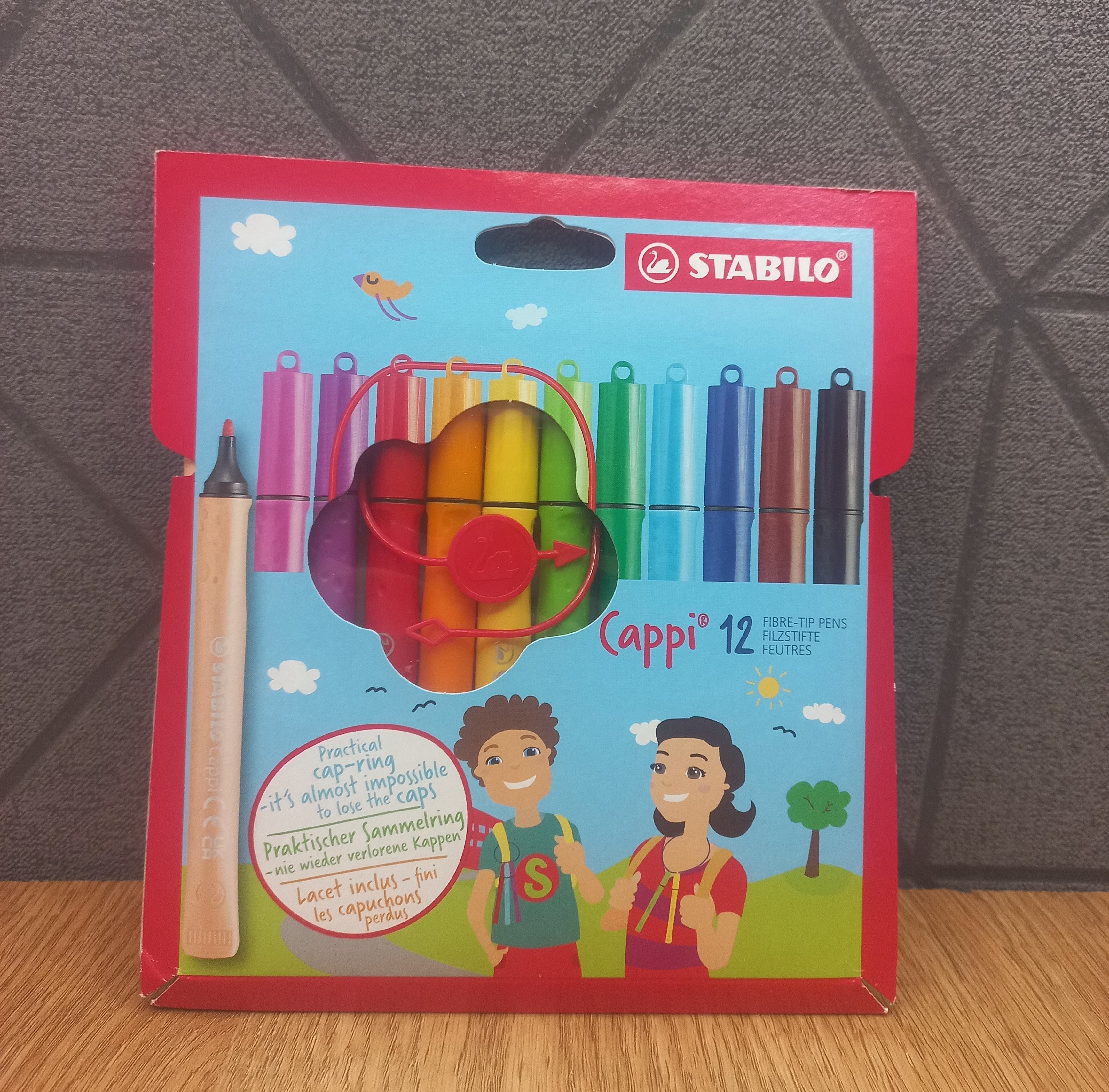 The STABILO Cappi Arty felt tip range have clever caps with a small ring at the top which means they can be threaded onto to a ring to keep them together. You can clip them onto a bag with a carabiner which is ideal for keeping them all in one place, especially when you’re out and about. It also means no lost lids too! The triangular shape is comfy to hold and it stops them rolling about on the table too. The slighter larger 1mm fibre tip gives bold, vibrant colour and the ink holds well on different thicknesses of paper and card. These pens are great for children as they can be left uncapped for up to 24 hours without drying out. Available in packs of 12 or 18 colours.